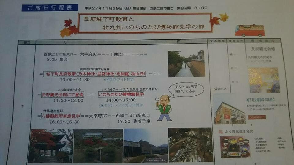 天拝山山頂報告 今朝の気温は14.8℃湿度は72%です。 今朝はパラッと小雨が降りました。 でも展望台の下でラジオ体操です。 九州国立国立博物館を愛する会は11月29日に 1日バスハイクを開催します。 目的地は長府城下町散策と北九州のいのちのたび博物館です。会員が対象ですが、会員の知人も参加できます。 費用は会員外は8500円です。 ご参加されたいかたは私にご連絡ください。 あおぞら保険はどんな会社? 会社案内をみる あおぞら通信・情報誌! こちらから