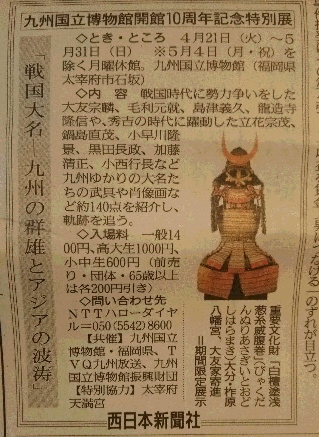 天拝山山頂報告 今朝の気温は7.3℃湿度は88%です。 九州国立博物館の次回の特別展示の紹介が 西日本新聞に記載されていました。 次回は4月21日から 【戦国大名、九州の群雄とアジアの波涛】です。 今までになかったテーマです。 私個人としては大変楽しみしている特別展です。 1. 落ち着いて対応 負傷者の救護・路上の危険防止。(119番) 2. 示談は避けましょう 警察への届け(110番) 3. 確認事項 事故状況の確認(目撃者がいれば、その方の電話番号)事故の相手の確認(名前・車の登録の番号・電話番号 お問い合わせ もしもの時の事故対応