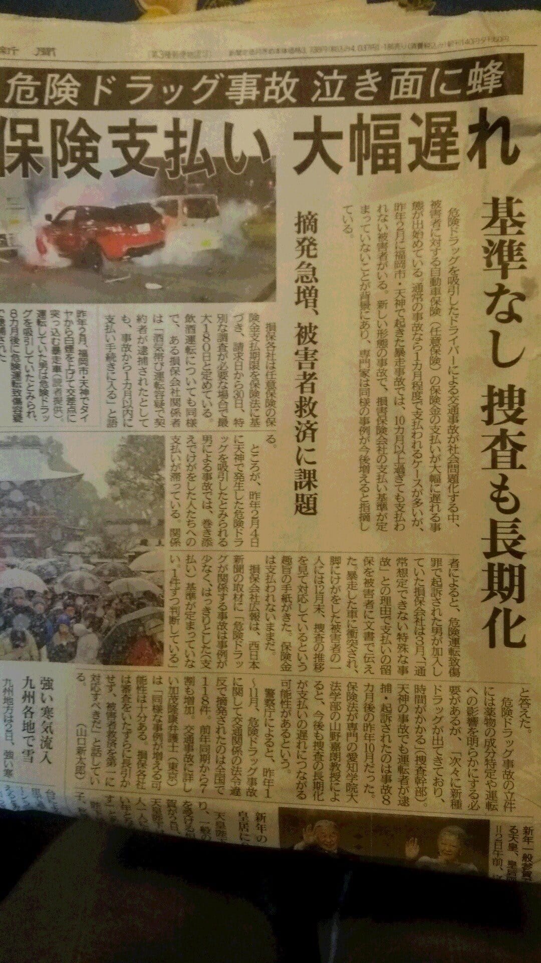 天拝山山頂報告 今朝の気温は1.6℃、湿度は76%てす。 昨日から咳がでたので マスクしながらの登山でした。 【ドラッグによる交通事故】の 保険金の事故の支払いが支払い基準がない為 遅れている記事が載っていました。 【被害者救済】の観点からなんとか、 保険会社もいっそう努力してもらいたいと 思います。 しかし危険ドラッグによる交通事故が 社会問題化するなんて 以前は考えられませんでしたよね。 今日で正月休みもおわりですね。 1. 落ち着いて対応 負傷者の救護・路上の危険防止。(119番) 2. 示談は避けましょう 警察への届け(110番) 3. 確認事項 事故状況の確認(目撃者がいれば、その方の電話番号)事故の相手の確認(名前・車の登録の番号・電話番号 お問い合わせ もしもの時の事故対応