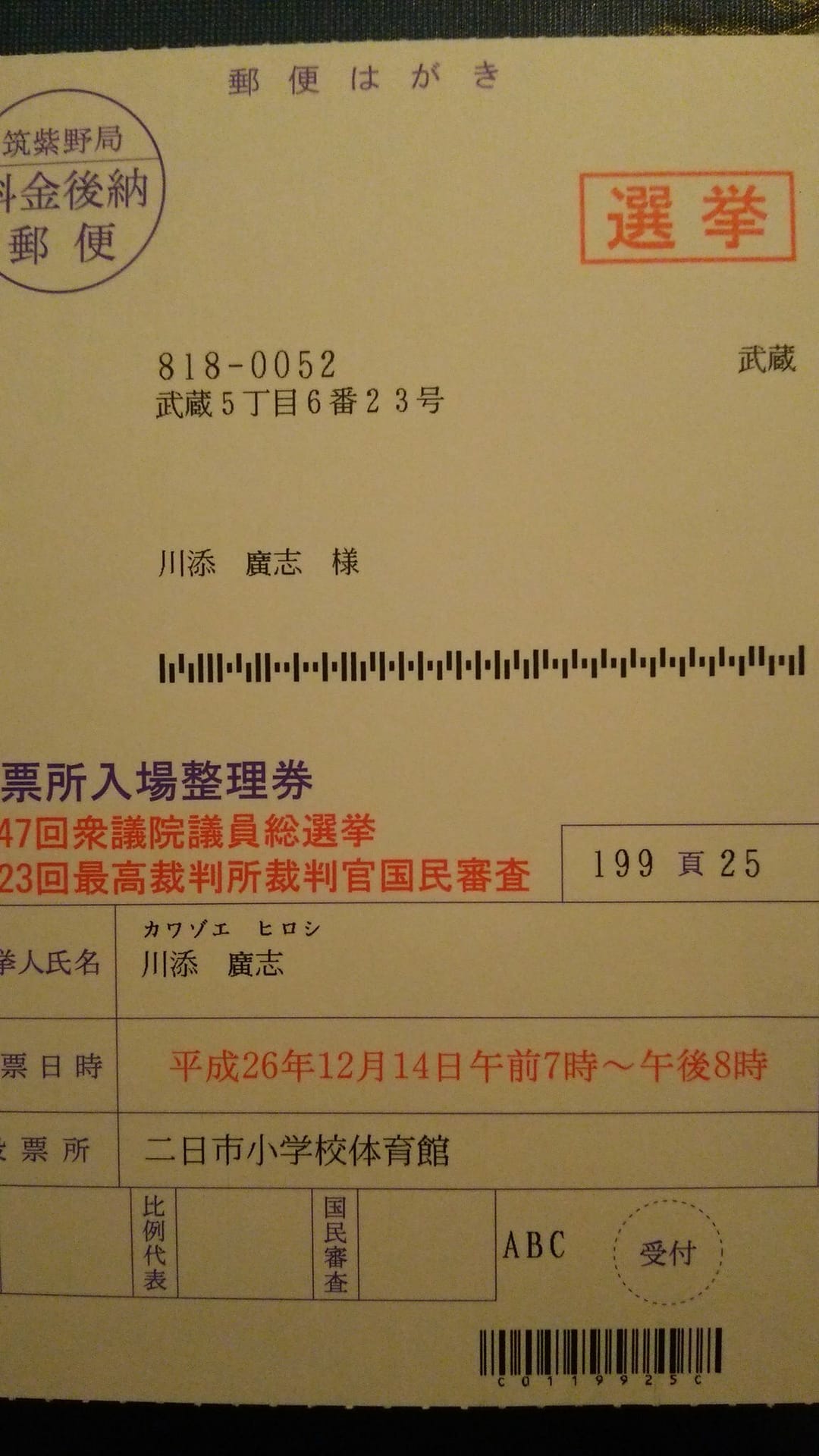 選挙のハガキが到着しました。