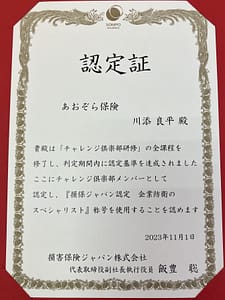 損保ジャパン社のチャレンジ倶楽部研修で研修修了者として登録されました。倶楽部メンバーは、「損保ジャパン認定 企業防衛スペシャリスト」の称号の認定を受けます。