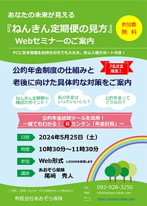 5月25日(土)10:30~ 事務所会議室において 「ねんきん定期便の見方」セミナーをWebオンラインにて開催いたしました。年金定期便の確認のポイント、年金額はいくら、と老後に向けた具体的な対策をご案内いたしました。3名 […]