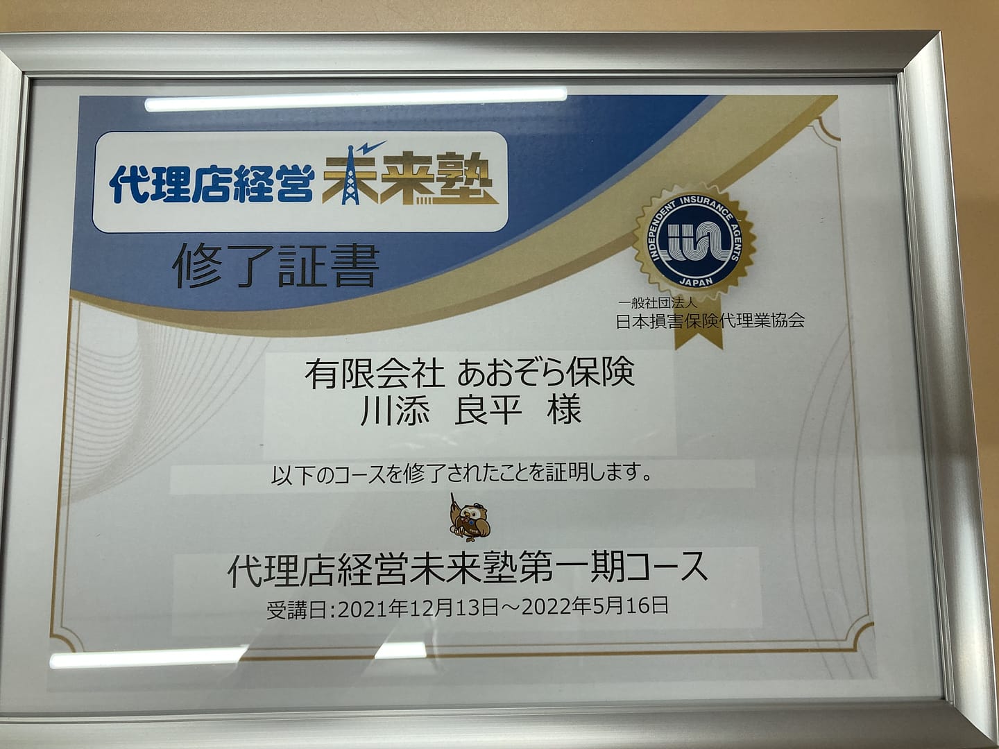当社社員 川添良平が一般社団法人「日本損害保険代理業協会」の代理店経営未来塾第一期コースを修了いたしました。
