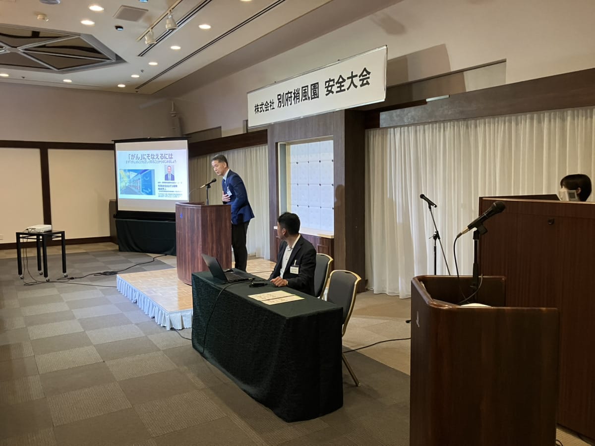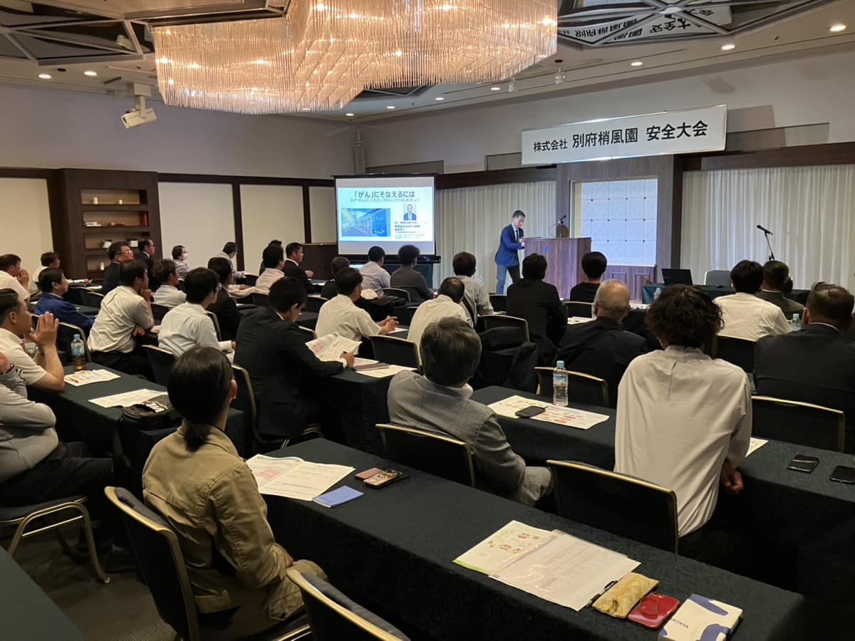 6月某日、株式会社別府梢風園さまの「安全大会」の中でお時間をいただき、従業員さま並びに関係会社さま向けに「がんにそなえるには」と題して、がんセミナーを実施しました。