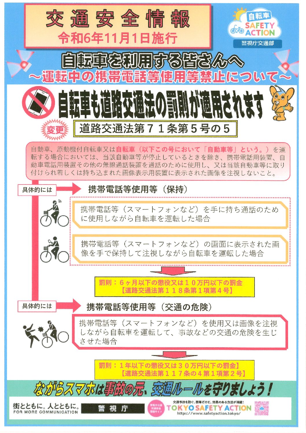 交通安全情報:自転車も道路交通法の罰則が適用されます。 2024年11月5日 最終更新日時 : 2024年10月31日 PLUMs 損保ジャパン代理店 自転車の運転中の携帯電話等使用等禁止及び酒気帯び運転等が禁止となります。 ヘルメットの着用含めてルールの順守を心がけましょう! こんな会社ですお客さまの意向を忠実に反映し、 誠心誠意、迅速に的確なご提案をいたします。 これは私達PLUMsスタッフの目指すところです。詳しくはこちら