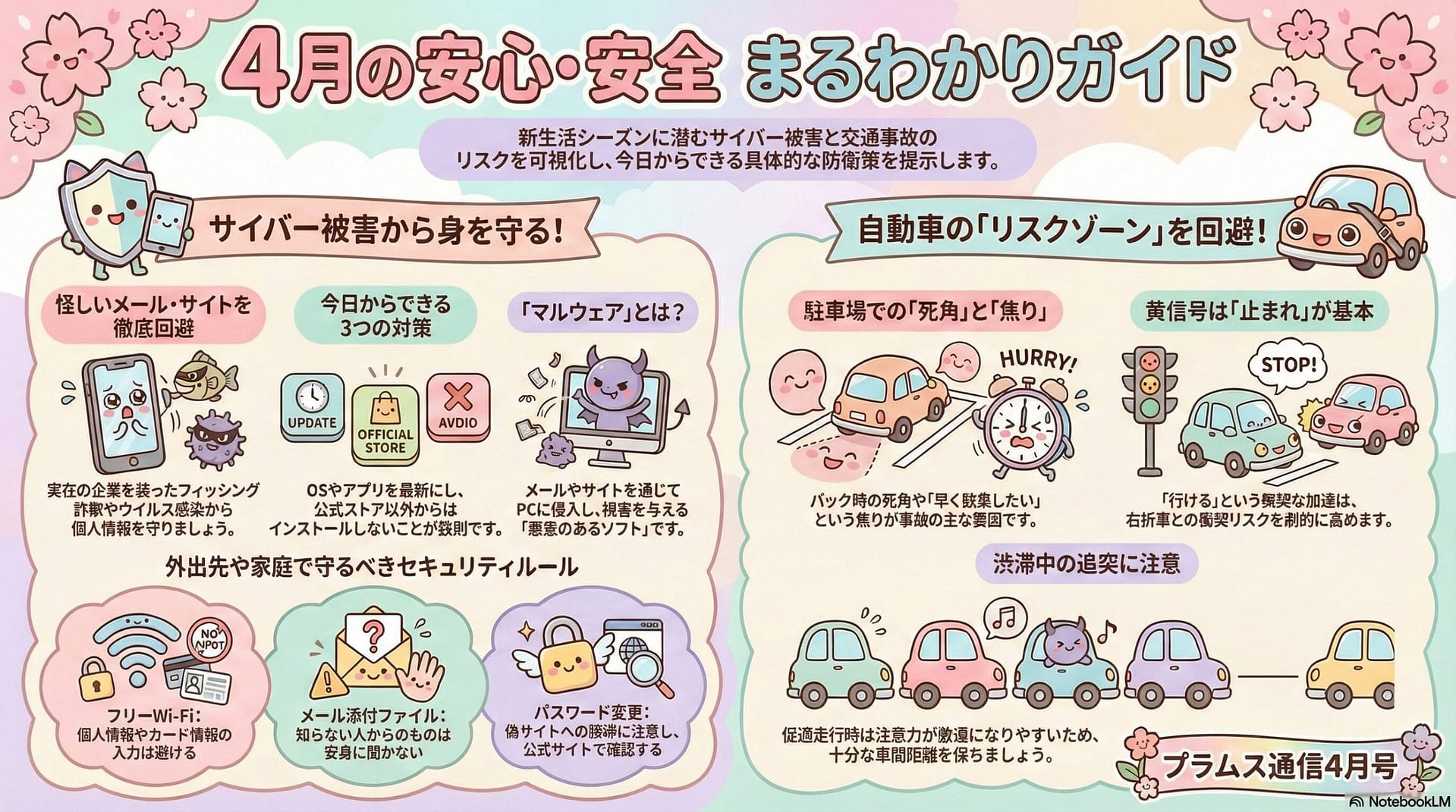 PLUMs通信4月号発刊!(2026) 2026年4月9日 最終更新日時 : 2026年4月10日 PLUMs 損保ジャパン代理店 お客さま向けの情報誌「PLUMs通信」4月号を発刊いたしました。 PLUMs通信はこちらから 1. 落ち着いて対応 負傷者の救護・路上の危険防止。(119番) 2. 示談は避けましょう 警察への届け(110番) 3. 確認事項 事故状況の確認(目撃者がいれば、その方の電話番号)事故の相手の確認(名前・車の登録の番号・電話番号 お問い合わせ もしもの時の事故対応