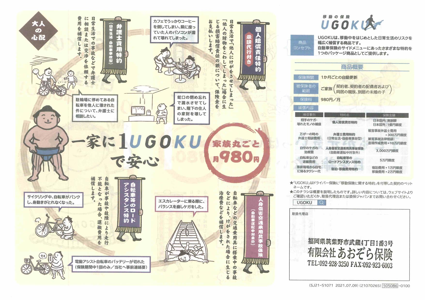 移動の保険「UGOKU(うごく)」の取扱を開始しております。 2021年8月12日 最終更新日時 : 2021年8月12日 PLUMs 損保ジャパン代理店 UGOKUは移動中をはじめとした日常生活のリスクを幅広く補償する商品です。 詳細は当社担当者まで問い合わせ願います こんな会社ですお客さまの意向を忠実に反映し、 誠心誠意、迅速に的確なご提案をいたします。 これは私達PLUMsスタッフの目指すところです。詳しくはこちら