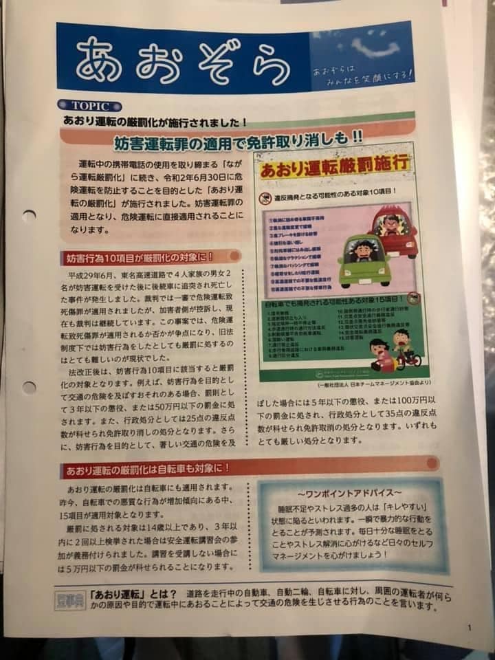 ■日本代協製作の情報紙あおぞら通信の秋号が完成しました。あおり運転の厳罰化がテーマです。月曜日から情報紙を使って、心の余裕のある運転をお客さんにお伝えしようと思います!